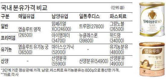 매일유업은 프리미엄 제품을 없애는 대신 유기농 분유인 '앱솔루트 유기농 궁'을 내놓으면서 가격을 3만5900원으로 정했다. 남양유업과 파스퇴르의 경쟁제품보다 가격(800g 환산 기준)을 25.2~30.4% 낮춘 것이다. 매일유업 관계자들은 리뉴얼을 발표하기 전 소비자시민모임 등 소비자 단체를 찾아가 "리뉴얼에 따른 가격 조정은 가격을 올린 게 아니라 내린 것"이란 내용으로 설명한 것으로 알려졌다.