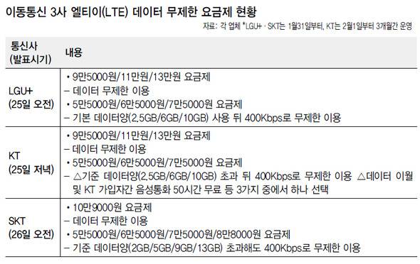 지난 25일 오전 엘지유플러스(LGU+)가 엘티이 가입자들에게 데이터를 무제한으로 이용할 수 있게 하는 요금제를 출시하자, 케이티(KT)는 당일 저녁, 에스케이텔레콤(SKT)은 다음날 오전 동참을 선언했다. 세 회사가 밝힌 데이터 무제한 엘티이 요금제 구조는 비슷하다. 9만5000원~13만원 요금제의 경우, 매달 14GB(기가바이트)~25GB에 이르는 기본 제공 데이터양을 모두 사용하고도 매일 3GB를 더 쓸 수 있고, 그 이상도 속도를 낮춘(2Mbps) 조건에서 무제한 이용할 수 있도록 했다. 5만5000원~8만8000원 요금제는, 2GB~13GB에 이르는 기본 제공량을 소진한 뒤 400Kbps 속도로 데이터를 무제한 이용할 수 있다.