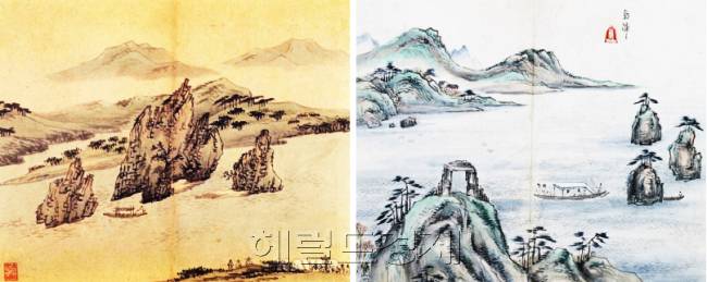 도담삼봉이 조선 묵객들의 시각에 비친 모습. 왼쪽은 조선화가 김홍도 작품, 오른쪽은 이방운 작품이다. |