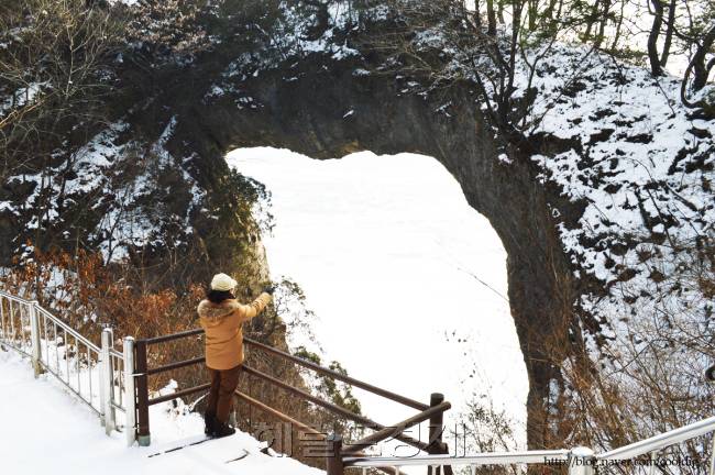 무지개 처럼 원을 그리며 뻥 뚫린 지형 석문이다. 뚫린 곳의 하얀 부분이 남한강의 눈이다. |