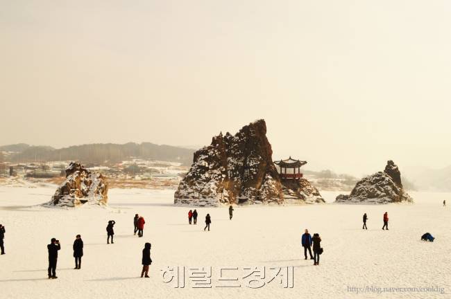 도담삼봉의 운치넘치는 설경. 정자도 품위있어 보인다. 얼음이 꽁꽁 언 남한강은 관광객의 멋진 놀이터가 돼줬다. |