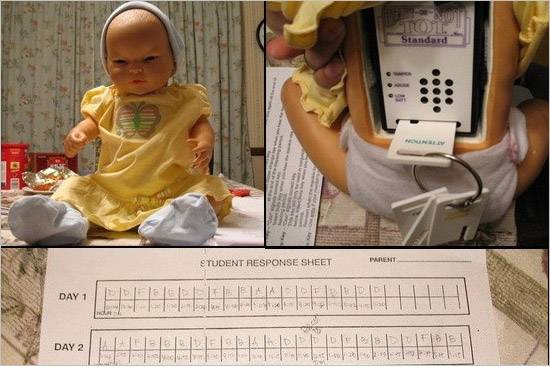 미국 학생들은 남녀 구분 없이 일주일간 '성교육용 아이 키우기' 과제를 수행해야 한다. 아이를 키우는 일이 얼마나 힘든지 직접 체험하라는 의도일까. 신생아 모양의 인형은 신생아와 똑같은 행동을 하도록 만들었다.