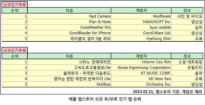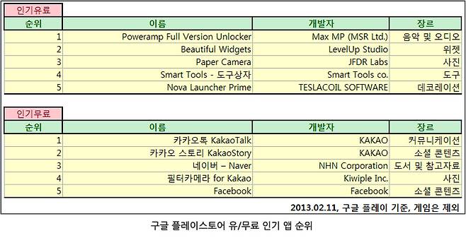 스마트폰이 인기를 끌면서 스마트폰용 애플리케이션(이하 앱)시장이 전체 IT시장의 한 축을 이루게 되었다. 하지만 앱이 너무 많고, 비슷한 것도 많다. 이에 수많은 앱 중 어떤 것이 인기가 있고, 유용한지 한눈에 볼 수 있게 정리했다. 본 정리 내용은 매주 월요일, 구글 플레이스토어 홈페이지와 애플 앱스토어의 순위를 참고했으며 게임 항목은 제외했다.