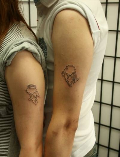 커플들에게는 둘이 모여야 비로소 짝이 완성되는 '조합형 타투'가 특히 인기다. 각자의 등에 각각 천사와 악마, 열쇠와 자물쇠 등을 새기는 식이다. 똑같은 위치에 긴 문구를 새겨 넣어 나란히 서면 마치 한 세트처럼 보이는 연출효과가 있다.