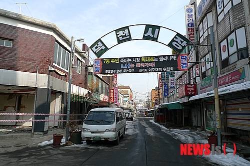 마을 한복판에 자리한 덕천시장. '덕천시장'이라고 적힌 아치 모양의 게시판 아래는 재개발 반대 주민이 걸은 원색적인 구호의 현수막이 나부꼈다.