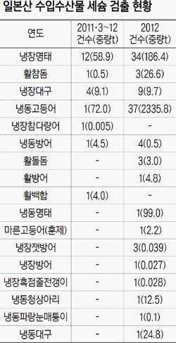 농림수산식품부와 농림수산검역검사본부는 일본산 수산물에 대한 세슘(134Cs+137Cs) 검사 결과 2011년 21건에서 2012년 101건으로 검출 건수가 5배로 증가했다고 28일 밝혔다. 물량은 21건 149t에서 101건 2705t으로 18배나 늘었다.