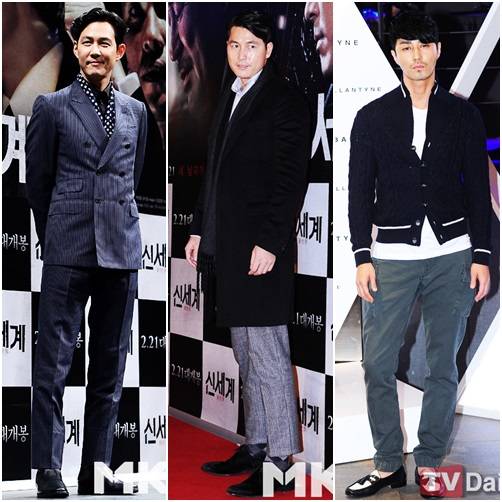 그의 절친한 친구인 배우 정우성도 영화 '신세계' 시사회에 참석해 중후한 매력을 과시했다. 그는 화이트 셔츠와 그레이 머플러, 팬츠로 톤온톤 스타일을 표현하는가 하면 여기에 아가일 패턴 양말로 위트를 더한 클래식룩을 선보였다.