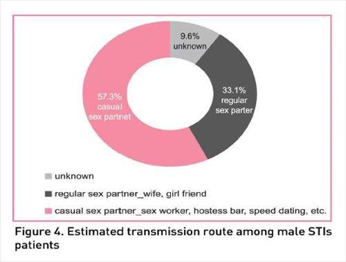 성병 감염 경로를 추적하기 위해 일부 지역 소재 21개 비뇨기과 병원에서 급성기 매독과 요도염으로 진단 또는 치료받은 남성 환자 1천65명을 조사한 결과, 응답자의 57.3%가 "비고정(casual) 성파트너와의 관계를 통해 전염됐다"고 밝혔다. 33.1%는 배우자나 연인 등 고정적(regular) 성파트너로부터 옮은 경우였다.