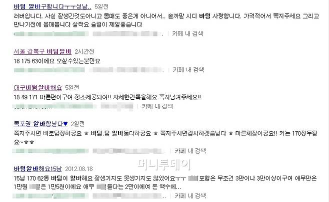 '바텀'은 동성 간의 관계 시 여성 역할, '탑'은 남성 역할을 뜻한다. "어린 바텀 구합니다"는 제목의 글에는 "비용은 물론 용돈 많이 챙겨 드릴 수 있습니다. 전 20살이구요. 톡 주세요"라는 내용이 실려 있었다. 사이트에서 매일 수십 명이 키와 몸무게, 나이, 성향, 연락처 등 자신의 프로필을 올려 성을 사거나 팔 대상을 찾는다. '알바후기'를 찾는 것도 어려운 일이 아니다.
