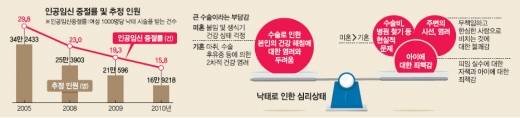 그러나 여자들은 수술대에 올랐고, 지금도 오르고 있다. 보건복지부가 전국 가임기(15~44세) 여성 4000명을 대상으로 조사해 2011년 발표한 실태조사에 따르면 가임기 여성 1000명당 낙태 건수를 뜻하는 '임신중절률'은 2010년 15.8건이었다. 당시 가임기 여성 수(약 1071만명)를 고려하면 그해 약 17만명의 태아가 세상 빛을 못 보고 목숨을 잃은 셈이다.