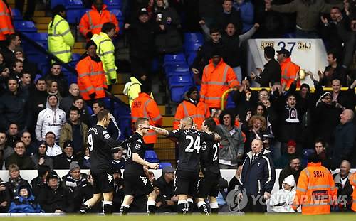epa03629415 Players of Fulham FC celebrate after Dimitar Berbatov (L) scored against Tottenham Hotpsur during the English Premier League soccer match between Tottenham Hotspur and Fulham FC at the White Hart Lane Stadium in London, Britain, on 17 March 2013. EPA/KERIM OKTEN DataCo terms and conditions apply. https://www.epa.eu/downloads/DataCo-TCs.pdf ☞ 일진그룹, 예일대 MBA 학생에 창업정신 강연☞ 신화 "20주년, 30주년까지 계속 춤추고 노래할 것"☞ 김기식 "신제윤 내정자 업무추진비 내역 허위신고"(종합)☞ 김연아 세계선수권 218.31점으로 우승(종합4보)☞ 정부개편안 최종 타결…'교착 정국' 극적 해소