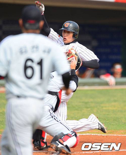[OSEN=부산,박준형 기자]19일 오후 부산 사직구장에서 열리는 '2013 한국야쿠르트 세븐 프로야구' 롯데 자이언츠와 LG 트윈스의 시범경기,6회말 2사 2루 롯데 손아섭의 안타때 2루 주자 박기혁이 LG 현재윤 포수에게 태그아웃되고 있다.
