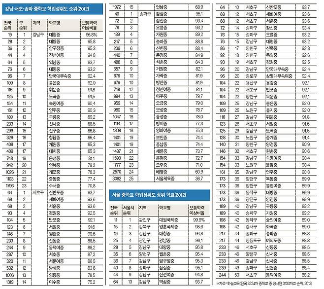초등학교의 경우, 전국 순위 500위 안에 든 강남 3구 학교는 왕북초·대도초(이상 강남구)·원명초·반포초(이상 서초구)·오륜초·세륜초(이상 송파구) 6곳뿐이었다. 사교육 1번지라는 말이 무색할 정도다. 하지만 중학교는 명성 그대로였다. 강남 3구에 있는 중학교 63곳의 절반에 가까운 29개 중학교가 서울시 상위 50위 안에 들었다. 강남구 학교가 14곳으로 가장 많았고, 서초구와 송파구가 각각 9곳과 6곳이었다. 서울시 상위 20위권으로 더 좁혀서 살펴보면 6개 학교를 빼곤 모두 강남 3구 학교다. 나머지 학교 역시 국제중 두 곳을 포함해 광진구 광남중(4위)과 양천구 월촌중(6위)·신목중(17위)·목일중(18위) 등 교육열 높기로 유명한 지역 학교들이다.