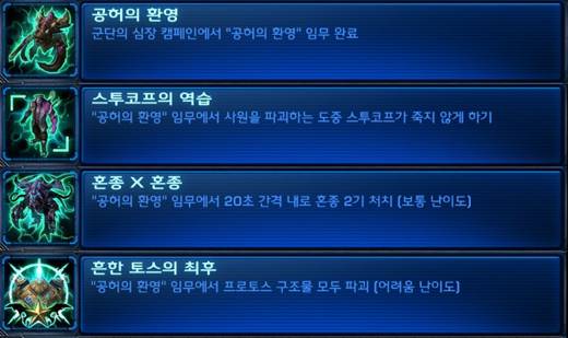 업적공허의 환영 - 군단의 심장 캠페인에서 "공허의 환영" 임무 완료스투코프의 역습 - "공허의 환영" 임무에서 사원을 파괴하는 도중 스투코프가 죽지 않게 하기혼종 X 혼종 - "공허의 환영" 임무에서 20초 간격 내로 혼종 2기 처치(보통 난이도)