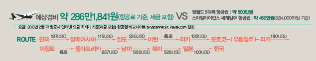 예상경비 약 286만1,841원(항공료 기준, 세금 포함)VS원월드 5대륙 항공권 : 약 500만원스타얼라이언스 세계일주 항공권 : 약 450만원(3만4,000마일 기준)