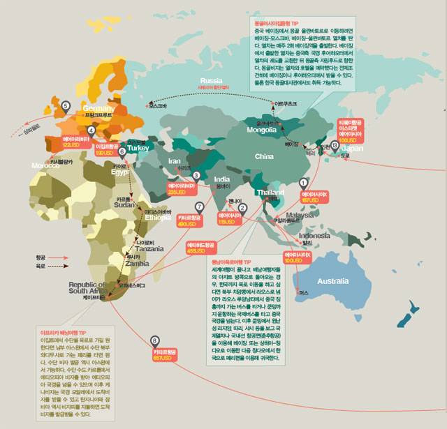 먼저 인천에서 쿠알라룸푸르까지 에어아시아 프로모션을 이용해 10만원대에 날아간다. 가까운 인도네시아 발리까지 10만원 이내(프로모션가)에 다녀올 수 있다.2쿠알라룸푸르에서 인도 첸나이, 뱅갈로르로 갈 경우 편도 100달러대에서 가능하다(인도비자는 사전에 발급 받아야 한다).3 인도여행을 마치고 뭄바이에서 이란 쉬라즈까지 에어아라비아로 역시 100달러 초반에 이동할 수 있다(이란도착비자 가능). 이란 쉬라즈, 야즈드, 이스파한을 거쳐 테헤란에서 터키 도우베야짓으로 육로이동이 가능하다.4 터키 일주 후 유럽일주를 원한다면 에어아라비아를 타고 모로코로 가서 스페인으로 육로이동을 하는 방법이 가장 저렴하다. 유럽일주를 끝내고 브뤼셀에서 칸쿤을 가는 저가항공편을 이용해 남미로 넘어갈 수 있다.5 유럽일주를 마치고 남미로 넘어갈 경우 프랑크푸르트에서 콘도르항공을 이용한다.6 중동으로의 육로이동은 과거엔 시리아를 통했지만 내전으로 인해 비행기를 타지 않고서는 이집트, 요르단, 이스라엘로의 이동이 불가능해졌다. 터키 이스탄불에서 이집트 카이로로 비행 이동을 할 경우 이집트항공으로 15만원에서 20만원대에 이동할 수 있다.7 LCC가 운항하지 않는 아프리카에서 한국까지 저렴하게 항공이동을 원한다면 중동을 거치는 카타르항공이나 에미레이트항공, 인도를 거치는 에어인디아 등을 이용한다.8 케이프타운까지 왔는데 돌아가기 아쉽다면 남미로 발길을 옮기자. 아프리카에서 남미로 가는 저렴한 항공은 거의 없지만 도하 경유 카타르항공편을 이용하면 그나마 저렴하게 이동할 수 있다.9 상파울로에서 브라질 주요도시를 보고 우루과이를 거쳐 아르헨티나로 가자. 아르헨티나에선 칠레나 볼리비아, 파라과이로 육로이동이 가능하다. 브라질에서 타 국가로 빠르게 이동하고 싶다면 브라질 저가항공인 탐항공( www.tam.com.br), 골항공( www.voegol.com) 등을 이용하면 된다.10 탐항공을 타고 브라질 마나우스에서 미국 마이애미, 브라질리아에서 마이애미로도 갈 수 있다(500~600USD).11 멕시코에서 미국 각 지역으로 이동할 경우 편도 100~200달러가 예상된다. 멕시코 북부에서 미국 샌디에이고까지 육로로 입국하는 방법도 있다.12 미국에서는 일본을 거쳐 한국으로 돌아오는 저렴한 항공권을 구입한다.13 일본에서는 여행 후 한국과 연결된 저가항공을 통해 인천, 김포, 김해공항을 선택해 간편하고 저렴하게 귀국할 수 있다.
