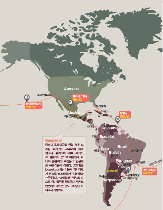 중남미여행 TIP중남미 육로이동을 원할 경우 브라질→파라과이→우루과이→아르헨티나→볼리비아→페루→에콰도르-콜롬비아 순으로 이동한다. 파나마 콜롬비아 구간은 치안문제로 육로이동이 어렵다. 코파항공(copaair.com)을 이용해 파나마로 가 버스로 코스타리카→니카라과→온두라스→과테말라→멕시코 순으로 중미일주를 완료한다. 멕시코 칸쿤에서 쿠바는 편도 200달러 이내에서 가능하다. ▶항공사 사이트 춘추항공 china-sss.com 중국동방항공 easternair.co.kr 볼라리스항공 volaris.mx 코파항공 copaair.com 골항공 voegol.com 탐항공 tam.com.br 카타르항공 qatarairways.com 이집트항공 egyptair.com 콘도르항공 condor.com 에어아라비아 airarabia.com 에어아시아 airasia.com