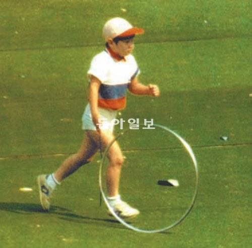 1988년 서울 올림픽 개막식 때 잠실 메인스타디움에서 굴렁쇠를 굴리며 등장하던 윤태웅 씨. 동아일보DB |