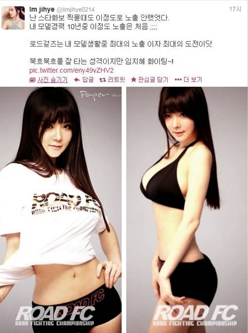 로드FC의 마스코트인 로드걸즈가 된 임지혜는 지난 25일 자신의 트위터에 "난 스타화보 찍을때도 이정도로 노출 안 했었다. 내 모델경력 10년중 이정도 노출은 처음. 로드걸즈는 내 모델생활 중 최대의 노출이자 최대의 도전이닷"이라는 글을 남겼다.