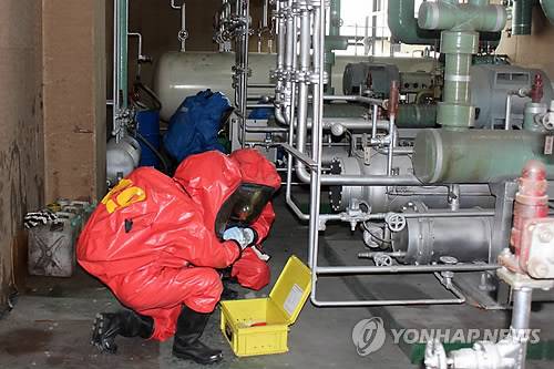 (부산=연합뉴스) 부산 항만소방서는 26일 부산 남구 우암동 대한통운 냉동창고에서 유해화학물질 누출사고 대응훈련을 했다. 2013.3.26 < < 항만소방서 > >