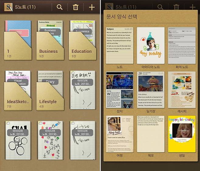 S노트는 낱장, 노트북, 노트북을 모은 폴더 형태로 노트를 관리한다. 노트북 3종 중 가장 많은 선택지를 갖고 있다. 표지는 만들어도 되고 안 만들어도 된다. 노트의 테마도 기본 노트와 아이디어 노트, 잡지, 일기장, 요리 레시피 등 다양하게 제공한다.