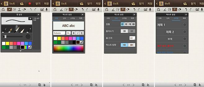 손글씨를 쓸 때 5가지 펜 종류를 활용할 수 있다. 일반 펜, 붓, 붓펜, 연필, 형광펜이 그것이다. 옵션 창에서 펜의 굵기와 색상을 선택할 수 있다. 투명도는 형광펜만 선택할 수 있다. 사용자가 원하는 색상을 색상표에서 찾거나 '스포이트' 아이콘으로 이미지 등에서 추출할 수도 있다. S노트의 키보드 입력은 문서 작성 프로그램처럼 시스템을 갖추고 있다. 글씨체, 색상은 물론 서식, 정렬 스타일, 줄 간격에 제목이나 목록 스타일까지 설정할 수 있다. 일목요연하게 자료를 정리하기 좋다.