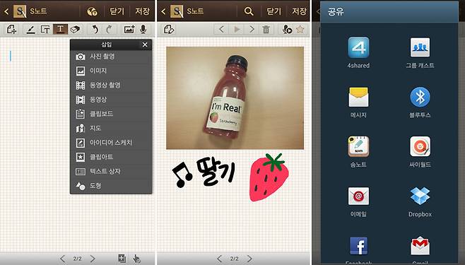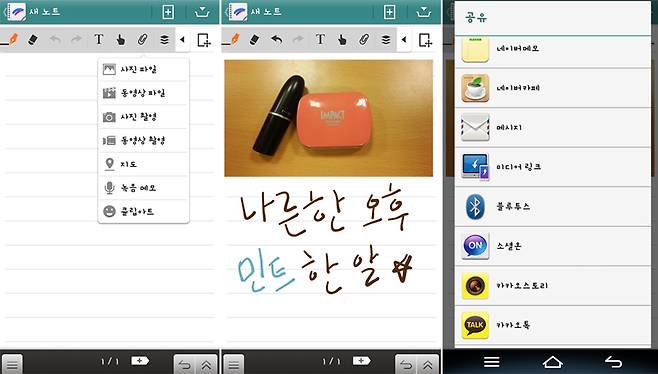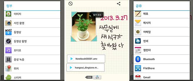 사진, 동영상, 지도, 녹음, 클립아트 등의 콘텐츠를 노트에 붙여 넣을 수 있다. 다 만든 노트는 메모, 메시지, 이메일, 메신저 등으로 공유도 가능하다.