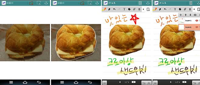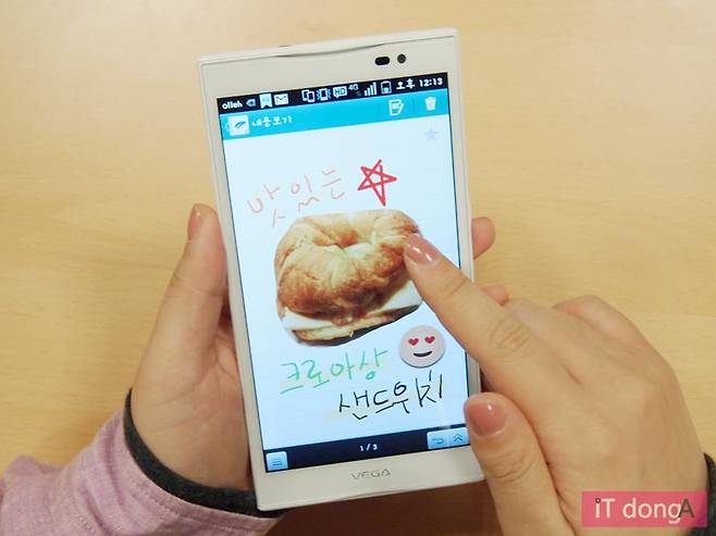 베가넘버6의 'V노트' 앱을 소개한다. 셋 중 가장 나중에 나와서인지 V노트는 '레이어' 기능, 사진 잘라서 넣기 등 섬세하고 진일보한 기능이 많다.