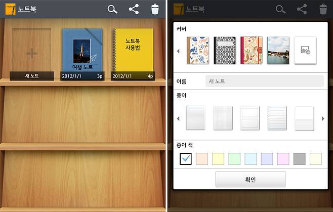 이제 옵티머스뷰2의 '노트북' 앱을 살펴본다. 옵티머스뷰2는 메모를 낱장이 아닌 '노트북' 형태로 관리한다. 한 장만 메모해도 무조건 표지가 달린 노트북으로 만들어야 한다. 일장일단이 있으므로 낱장으로 관리하는 것과 노트북으로 묶어 관리하는 것 중 어느 것이 더 우월하다고 판단할 수는 없다.