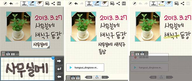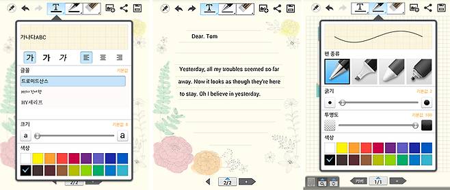 키보드 입력 시 글씨체, 크기, 색상, 투명도 등을 설정할 수 있다. 손글씨용 펜 종류는 5가지다. 연필, 만년필, 크래용, 형광펜, 붓. 이 중 끝으로 갈수록 굵기가 점점 굵어지는 붓이 눈에 띈다. 난을 쳐도 될법하다. 연필로 글씨를 써도 선의 굵기가 자연스럽게 달라 날려 써도 느낌 있다. 키보드 입력과 손글씨 모두 기본 색상 외에 사용자가 원하는 색상과 투명도를 설정할 수 있다.