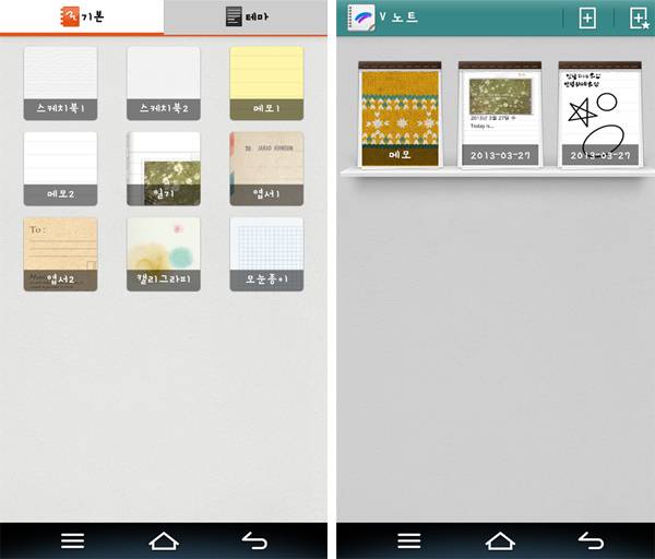 기본 노트 외에도 일기, 엽서, 캘리그라피, 요리책, 사진첩 등 노트 테마를 다양하게 제공한다. V노트는 노트를 낱장으로도, 노트북으로도 관리한다. 여러 개의 낱장을 묶어 노트북으로 만들 수 있다. 표지는 만들거나 만들지 않거나 사용자 마음이다.