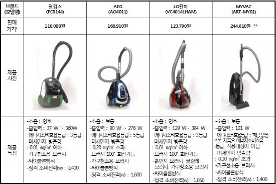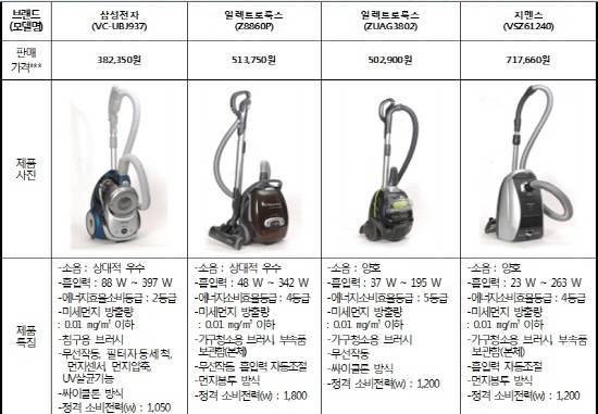 한편 미세먼지 방출량 면에서는 고급형 제품들이 모두 1제곱미터 당 0.01mg 이하인 것으로 조사됐다. 보급형 제품 중에는 독일 AEG, 말레이시아 MYVAC, 한국 루체스가 0.20mg을 초과했다. 삼성전자는 0.05mg 이하로 조사됐으며 LG전자 등 나머지는 0.01mg 이하였다.