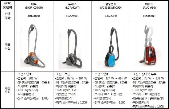 이번 조사는 삼성전자와 LG전자, 대우 등 국내 브랜드는 물론 다이슨, 지멘스, 닐피크스 등 해외 유명 가전브랜드 등을 통틀어 보급형 8종, 고급형 11종 등 총 14개업체 19개 제품을 대상으로 진행됐다.