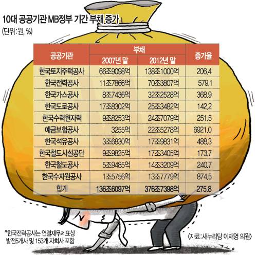 공공기관 부채 급증은 이명박정부가 2008년 글로벌 금융위기 이후 대대적인 국책사업을 추진하면서 나랏빚을 떠넘긴 영향이 크다. 불경기 여파로 서민생활이 팍팍해지면서 정부가 강력한 공공요금 규제에 나선 것도 공공기관의 빚더미를 더욱 키웠다. 박근혜정부가 근본적인 대책을 내놓지 않으면 국가 재정건전성에 시한폭탄이 될 수 있다는 지적이다.
