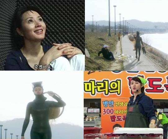 나머지 사진들은 김혜수가 현재 출연중인 KBS2 월화드라마 '직장의 신(극본 윤난중, 연출 전창근)' 방송 장면을 캡처한 것. 그는 해녀복을 입고 한강에서 바다까지 거슬러 올라가, 갓 잡아낸 게 300마리로 마트에서 즉석 게장 쇼를 선보이는 신공을 발휘했다.