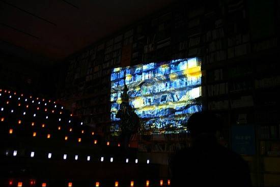 곧이어 불이 하나 둘 꺼지고 조용한 적막감이 도서관을 채웠다. 하지만 이날 저녁 서울도서관 2층에 있는 '생각마루 시민서가'의 불은 꺼질 줄을 몰랐다. 은은한 LED 양초가 서가 계단마다 작은 별처럼 수놓아지고, 벽면에는 빔 프로젝터가 쏜 고흐의 명화 '별이 빛나는 밤에'가 펼쳐졌다. '밤의 도서관, 그 신비로운 책 이야기'(이하 밤의 도서관) 행사에 오기로 한 손님맞이 준비가 한창이었다.