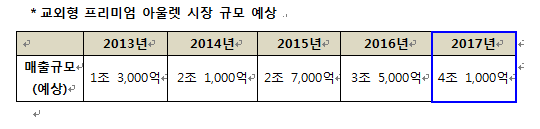 신세계는 교외형 프리미엄 아울렛 시장 규모가 올해 1조3000억원에서 2017년 4조1000억원으로 3배 이상 성장할 것으로 내다보고 있다.