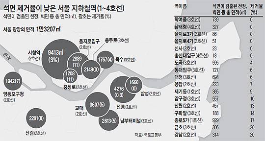 특히 유동 인구가 많은 환승역들의 석면 제거 비율이 낮았다. 공사 현황에 따르면 3호선 충무로(2149㎡·석면이 검출된 면적)·2호선 삼성(1660㎡)·3호선 학여울(739㎡) 등 8개 역은 석면을 아예 제거하지 않았고, 2호선 선릉(4276㎡)·2호선 시청(9413㎡)·3호선 옥수(1767㎡) 등 13개 역은 석면 제거 비율이 10%도 되지 않았다.