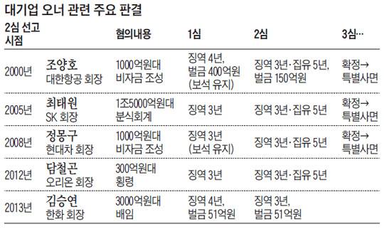 기업 분석 사이트인 재벌닷컴 등에 따르면 1990년부터 2012년 8월까지 경제 비리로 기소된 대기업 오너 7명이 총 22년 6개월의 징역형 판결을 받았지만, 모두 결과적으로 집행유예를 선고받았다. 1심에서 실형을 선고받더라도 2심에서 집행유예를 선고받고, 대통령 특별사면을 받는 것이 관행처럼 굳어져 있었다.