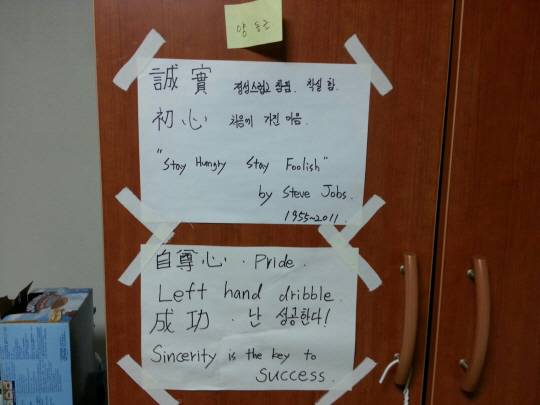 그런 바람직한 습관은 바뀌지 않았고, 메모지 내용만 지적사항에서 자신이 명심해야 할 구호들로 바뀌었을 뿐이다. 2011년 세상을 떠난 스티브 잡스의 명언 'Stay hungry, Stay foolish(늘 갈망하고 우직하게 정진하라)'를 비롯해 '초심을 잃지말자', '난 성공한다', '기회는 준비된 자에게 주어지는 선물이다' 등 교훈이 될 구호들이 눈에 띈다.