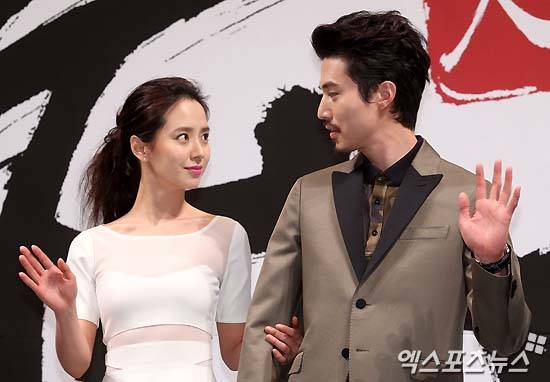 [엑스포츠뉴스 = 김성진 기자] 17일 오후 서울 강남구 논현동 임피리얼 팰리스 호텔에서 열린 KBS '천명:조선판 도망자 이야기' 제작발표회에 송지효(왼쪽)와 이동욱이 포즈를 취하고 있다.