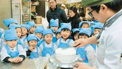 '발할라' 요리체험 교실에 참가한 유치원생들이 케이크 만드는 모습을 지켜보고 있다. 조영회 기자26일 오전 10시. 천안시 불당동에 있는 패밀리레스토랑 '발할라'에 아장아장 꼬마 손님들이 북적이었다. 젤라유치원 원생 26명이 '발할라'에서 개최하는 요리체험 교실에 참여하기 위해 모인 것이다.