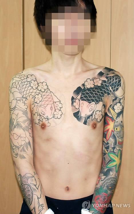 (서울=연합뉴스) 22일 또래 학생들의 금품을 빼앗은 혐의(공동공갈 등)로 서울 수서경찰서에 입건된 한 청소년의 상반신에 화려한 문신이 새겨져있다.