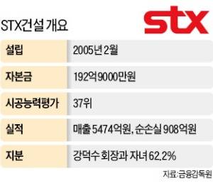 2005년 설립된 STX건설은 그룹공사와 관공사 수주 등에 힘입어 7년 만에 시공능력평가 30위권(37위)에 진입했다. 주택경기 침체로 부동산 프로젝트파이낸싱(PF) 대출 부담이 눈덩이처럼 불어난 게 법정관리를 선택한 직접적인 이유로 꼽힌다.
