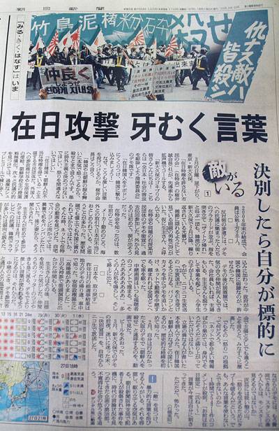 아사히신문은 지난해 보수 성향의 아베 신조(安倍晋三) 정권을 탄생시키는 데 일조한 넷우익들이 이후 반한 시위와 과격발언을 이어 가는 사회 현상을 이 남성의 시선을 통해 28일 보도했다.