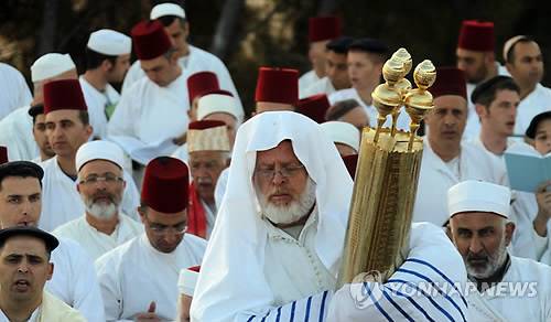epa03681984 Members of the Samaritan community pray atop Mount Gerizim, above the West Bank city of Nablus, at sunrise on 30 April 2013, during a religious service marking the end of their Passover holiday. According to tradition, the Samaritans are descendants of the Jews who were not deported when the Assyrians conquered Israel in 722 BC. The small community numbers about 700 people, half of them live in a village at Mount Gerizim, near the Palestinian city of Nablus, and the rest in Holon near Tel Aviv in Israel. EPA/ALAA BADARNEH