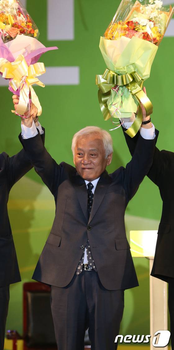 4일 오후 경기 고양시 킨텍스에서 열린 민주당 5.4 정기전국대의원대회에서 당대표로 선출된 김한길 대표가 꽃다발을 들고 대의원들에게 인사를 하고 있다. 2013.5.4/뉴스1