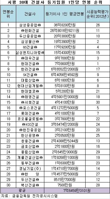 건설업체의 기술능력, 신인도, 공사실적, 재무상태 등을 종합적으로 평가한 시공능력평가 순위와는 다소 차이가 있다. 오너가 등기이사로 있는 경우 평균연봉이 높은 경향이 있는 것으로 분석된다.