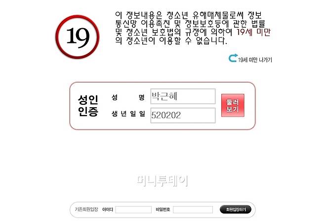 네이버에 생년월일이 공개된 박근혜 대통령의 정보를 입력했더니 무사통과했다. 나머지 사이트 2곳도 마찬가지. 이명박 전 대통령, 아이돌 그룹 멤버 등의 생년월일로 접근했더니 이내 '19금'화면으로 가득찬 페이지가 떴다. 접속까지 걸린 시간은 단 10초.