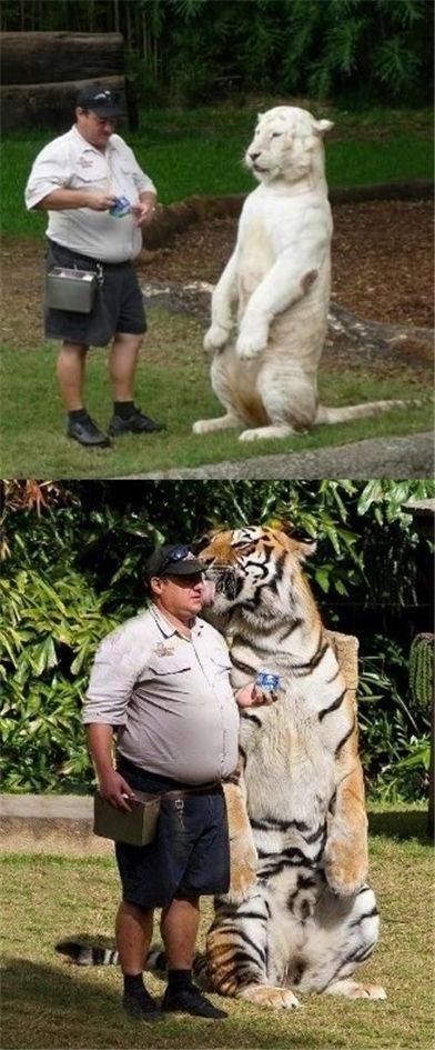 공개된 사진에는 동물원 사육사와 두 발로 선 채 그 곁에서 얌전하게 기다리고 있는 호랑이의 모습이 담겨 있다. 사진 속 호랑이는 사육사의 얼굴을 핥아주며 덩치에 어울리지 않는 애교를 부리기도 했다. 흡사 고양이 같은 귀여운 모습이 보는 이들의 미소를 자아낸다.
